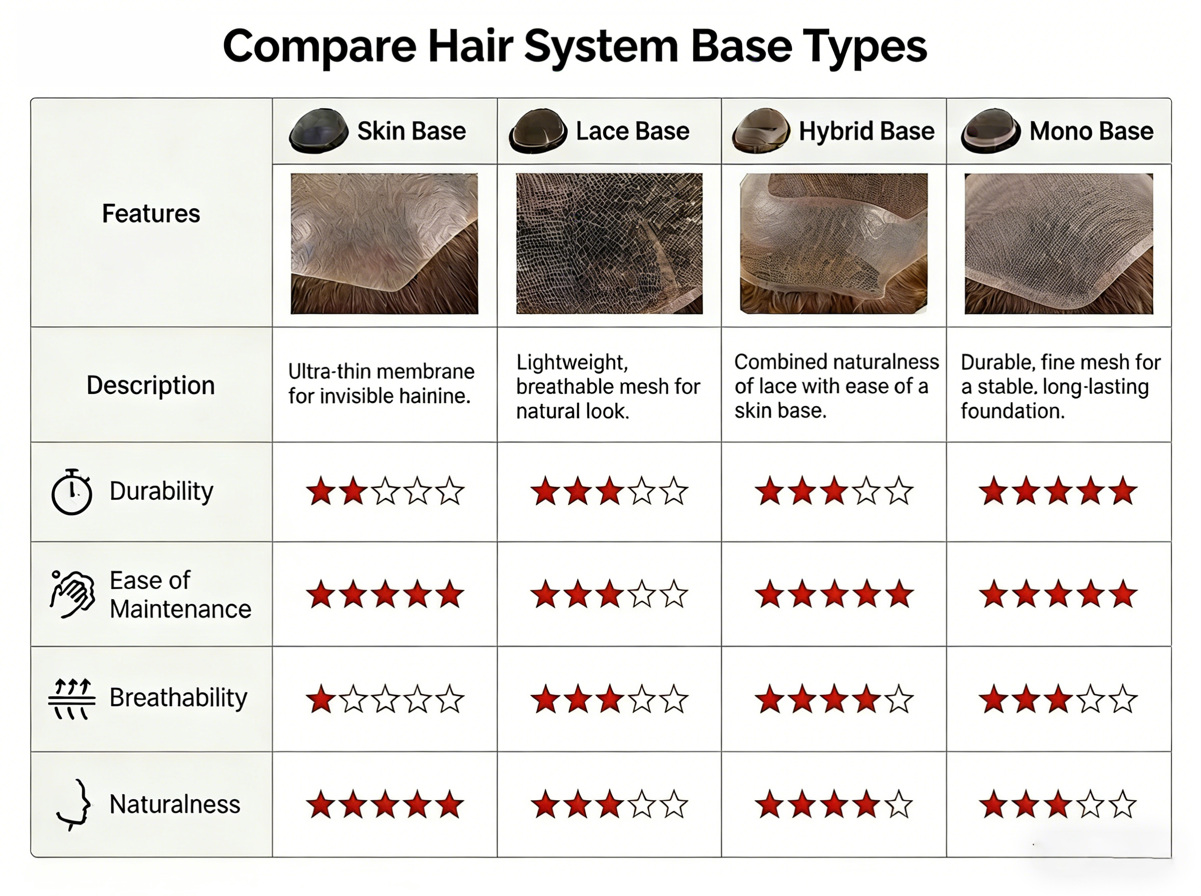 Choosing the right hair density will depend on factors such as your age, eye color, and the base type. For example, if you want a natural-looking thin skin system, you will need to go with a lighter hair density. More durable monofilament systems, on the other hand, can carry heavier hair densities which is why they are more durable.